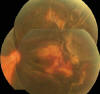 destaca la hemorragia masiva subretiniana, con grandes pliegues y bolsas. La