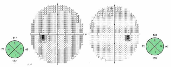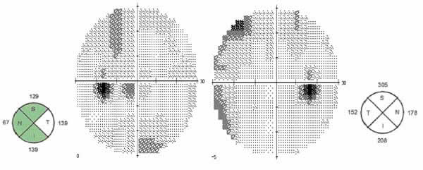 la capa de fibras y campimetrías del ojo izquierdo y derecho en el momento del