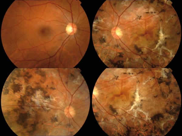 En los sucesivos meses desde el inicio del cuadro se observo una progresión de las lesiones hacia las arcadas temporales superior e inferior, alcanzando progresivamente la zona peripapilar manteniéndose la zona macular preservada dejando como secuelas placas atróficas corioretinianas en su evolución (fig. 3).